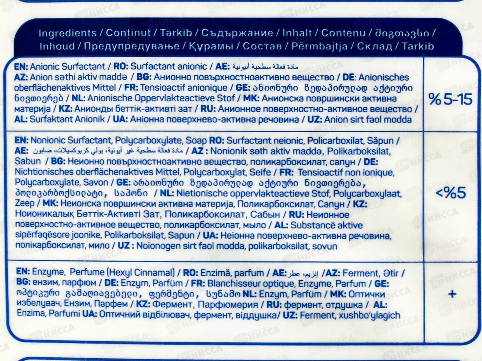 Состав: анионное поверхностно-активное вещество 5-15%, неионное поверхностно-активное вещество, поликарбоксилат, мыло, оптический отбеливатель, фермент, отдушка.