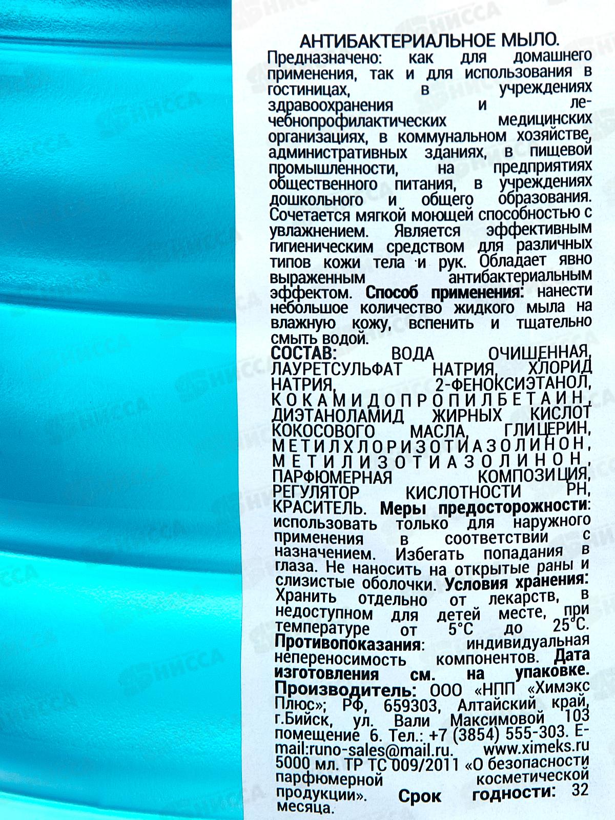 Обладает ярко выраженным антибактериальным эффектом, экономичное. Не содержит триклозан, фосфаты, гликоли. При мытье рук создается нежный обволакивающий слой пены на руках, а уже после смывания водой кожа рук остается чистой, нежной и ароматной. Способ применения: Нанести небольшое количество мыла на влажные руки, добиться образования пены и смыть проточной водой. СОСТАВ: вода очищенная, лауретсульфат натрия, хлорид натрия, 2-феноксиэтанол, кокамидопропилбетаин, диэтаноламид жирных кислот кокосового масла, глицерин, метилхлоризотиазолинон, метилизотиазолинон, парфюмерная композиция, регулятор кислотности РН, замутнитель, краситель. ФАКТОРЫ УСПЕХА Мыло антибактериальное - Атнибактериальный эффект. - Нежный приятный аромат. - Сбалансированная PH формула. - Идеальное сочетание цена/качество. ОБЛАСТЬ ПРИМЕНЕНИЯ: предназначено для применения в быту, в пищевой промышленности, на предприятиях общественного питания в учреждениях дошкольного и общего образования. Допускается использование средства в учреждениях медицинского профиля по назначению.