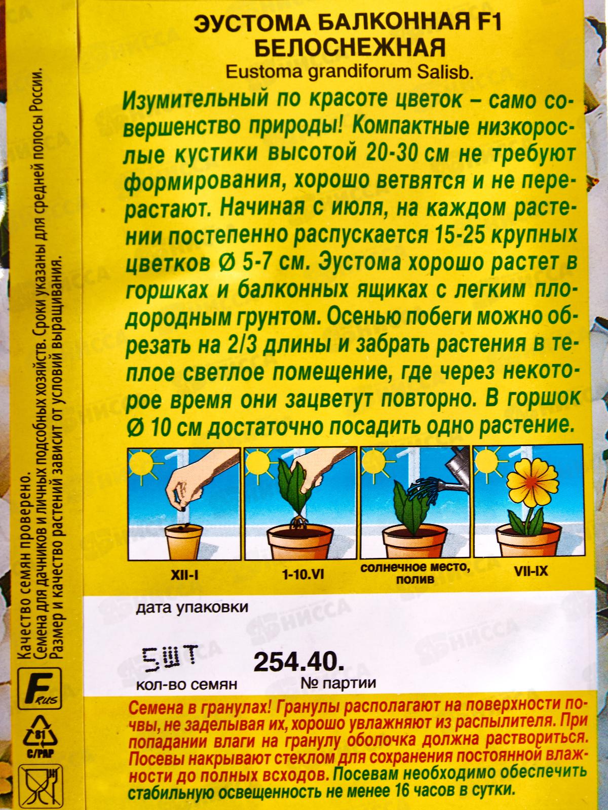 Компактные низкорослые кустики высотой 20-30 см не требуют формирования, хорошо ветвятся и не перерастают. Начиная с июля, на каждом растении постепенно распускается 15-25 крупных цветков d - 5-7 см. Эустома хорошо растет в горшках и балконных ящиках с легким плодородным грунтом. Осенью побеги можно обрезать на 2/3 длины и забрать растения в теплое светлое помещение, где через некоторое время они зацветут повторно. В горшок d - 10 см достаточно посадить одно растение. Семена в гранулах! Гранулы располагают на поверхности почвы, не заделывая их, хорошо увлажняют из распылителя. При попадании влаги на гранулу оболочка должна раствориться. Посевы накрывают стеклом для сохранения постоянной влажности до полных всходов. Посевам необходимо обеспечить стабильную освещенность не менее 16 часов в сутки.