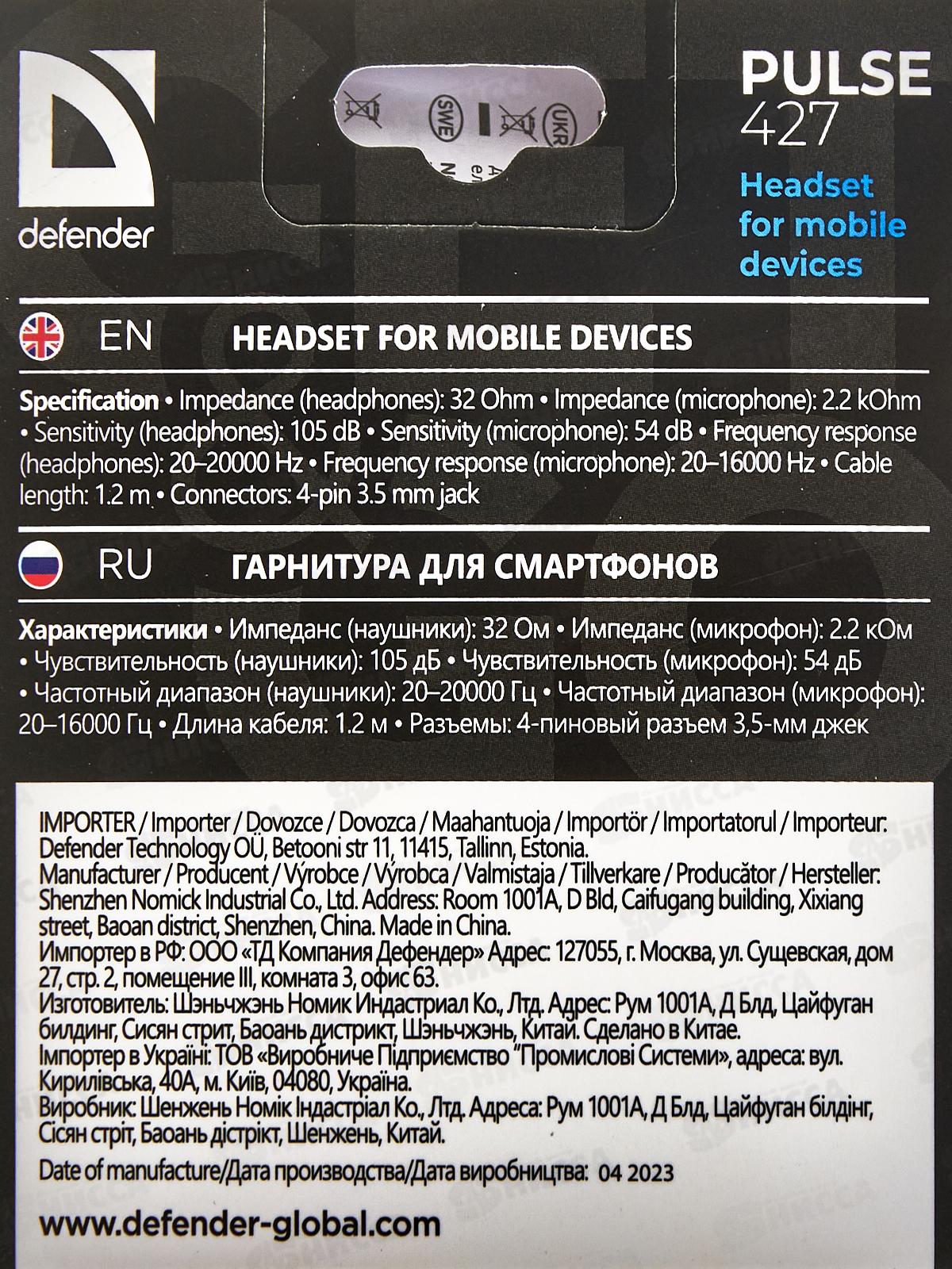 Гарнитура DEFENDER Pulse 427 Black вставки
