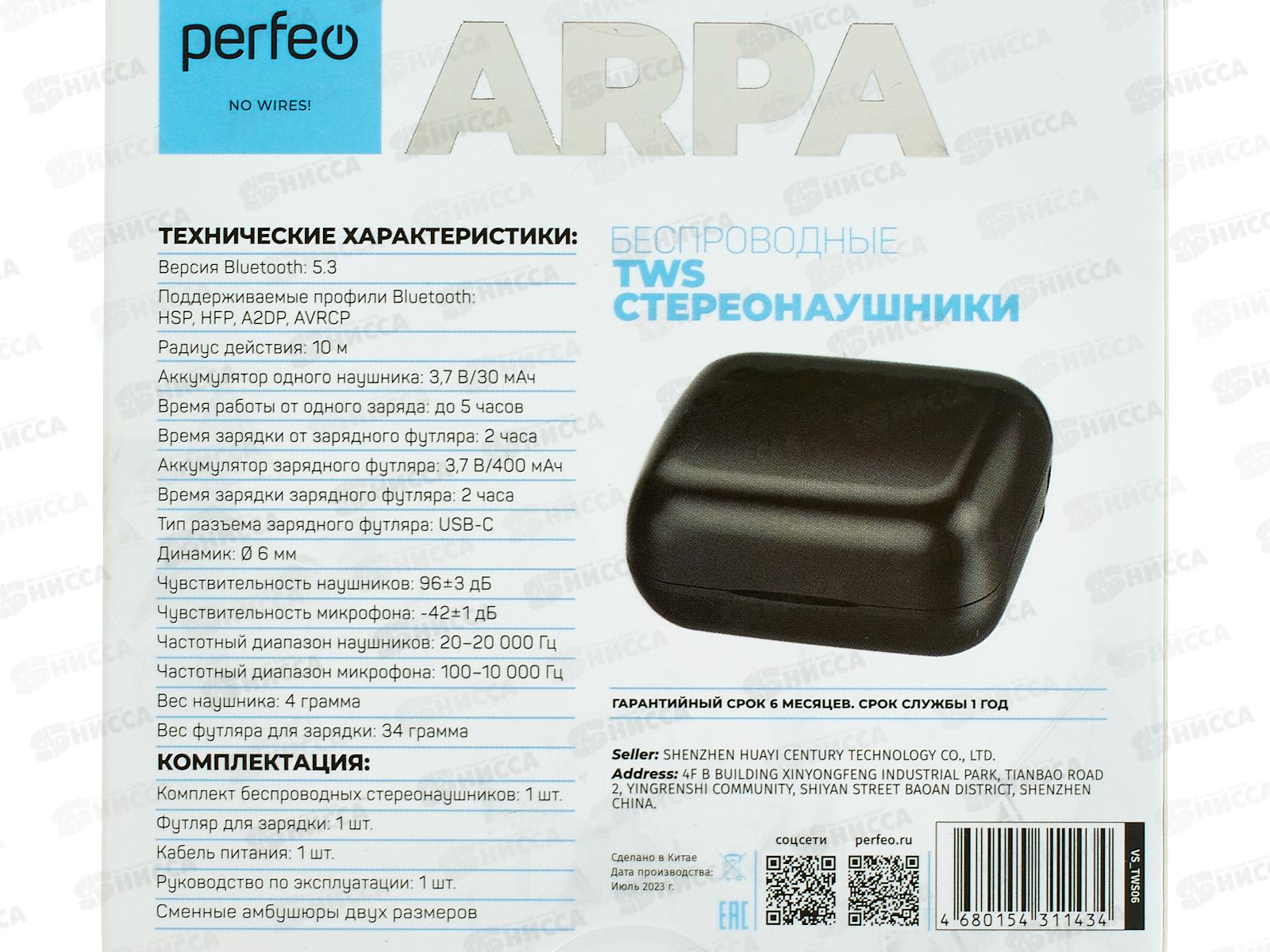 Гарнитура Perfeo ВТ TWS ARPA вкладыши черные автосопряжение