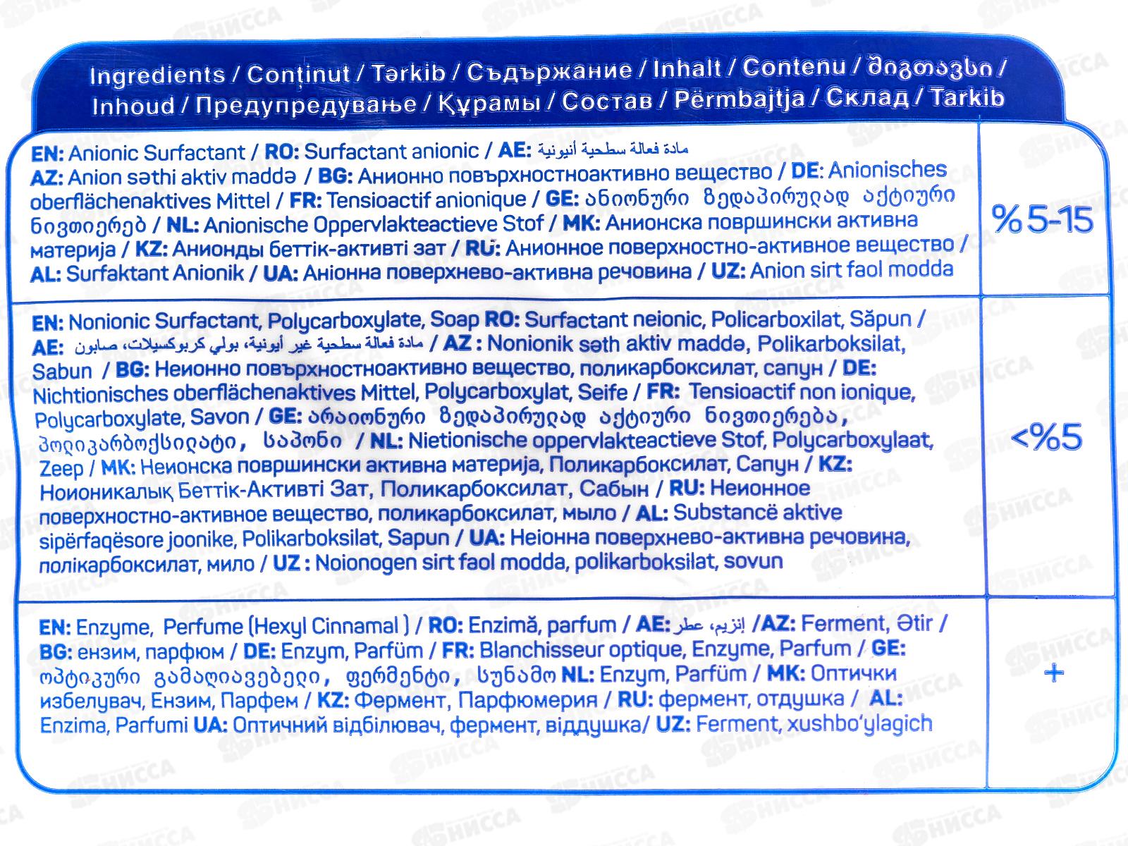 Состав: анионное поверхностно-активное вещество 5-15%, неионное поверхностно-активное вещество, поликарбоксилат, мыло, оптический отбеливатель, фермент, отдушка.